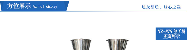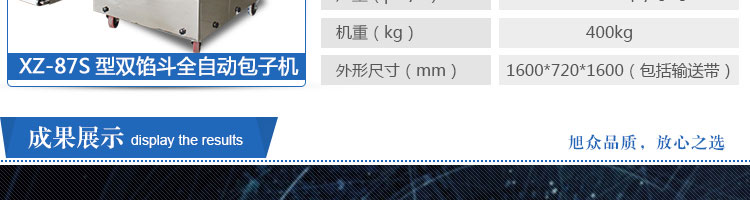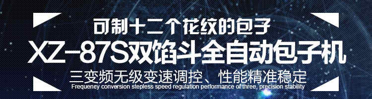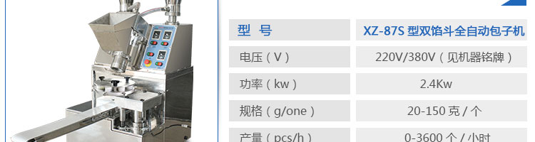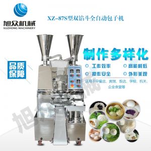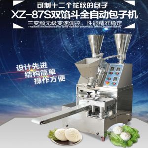 >XZ-87S型雙餡鬥全自動包(bāo)子(zǐ)機,可生(shēng)產各種(zhǒng)肉包、肉菜包、菜(cài)包、小(xiǎo)籠包、湯包、水晶包、圓饅頭、奶(nǎi)黃包、豆沙包、叉燒包、南瓜餅等幾十種(zhǒng)包餡製品。適(shì)用於賓館(guǎn)、飯店、學校、機關企業食堂、饅頭或包子加工(gōng)廠、早餐工程店及速凍食品廠等單位。可滿足不(bú)同客戶群體。免費提供工藝技術。免費上門培訓指導安裝。